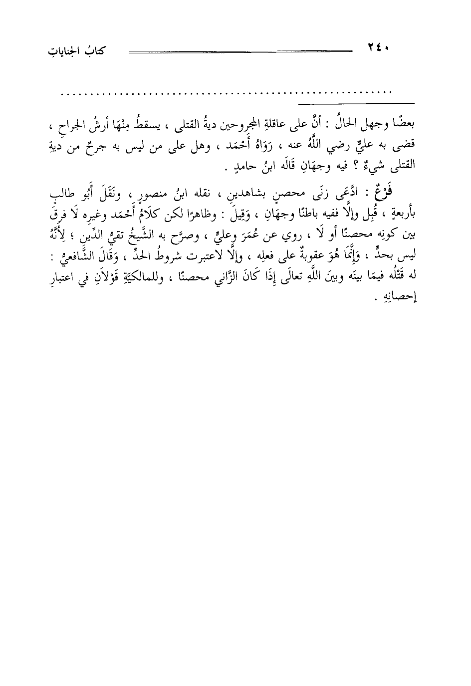 بعضا وجهل الحال أن على عاقلة المجروحين دية القتلى يسقط منها أرش الجراح قضى به علي رضي الله عنه رواه أحمد وهل على من ليس به جرح من دية القتلى شيء فيه وجهان قاله ابن حامد.