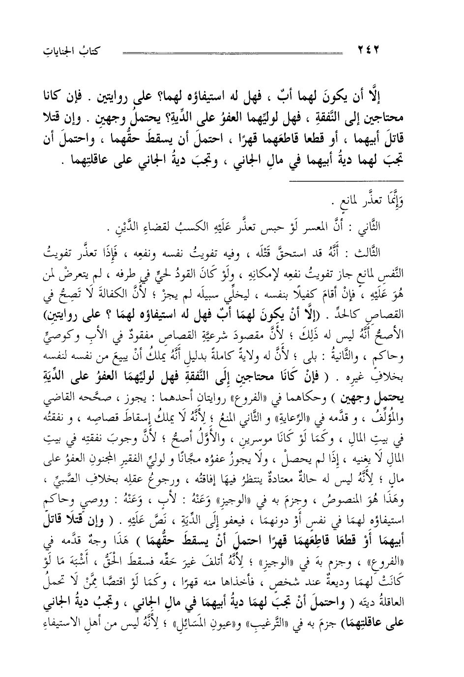 الثالث أنه قد استحق قتله وفيه تفويت نفسه ونفعه فإذا تعذر تفويت النفس لمانع جاز تفويت نفعه لإمكانه ولو كان القود لحي في طرفه لم يتعرض لمن هو عليه فإن أقام كفيلا بنفسه ليخلي سبيله لم يجز لأن الكفالة لا تصح في القصاص كالحد "إلا أن يكون لهما أب فهل له استيفاؤه لهما على روايتين" الأصح أنه ليس له ذلك لأن مقصود شرعية القصاص مفقود في الأب وكوصي وحاكم والثانية بلى لأن له ولاية كاملة بدليل أنه يملك أن يبيع من نفسه لنفسه بخلاف غيره "فإن كانا محتاجين إلى النفقة فهل لوليهما العفو على الدية يحتمل وجهين" حكاهما في "الفروع" روايتان أحدهما يجوز صححه القاضي و المؤلف و قدمه في "الرعاية" و الثاني المنع لأنه لا يملك إسقاط قصاصه و نفقته في بيت المال و كما لو كانا موسرين و الأول أصح لأن وجوب نفقته في بيت المال لا يغنيه إذا لم يحصل و لا يجوز عفوه مجانا و لولي الفقير المجنون العفو على مال لأنه ليس له حالة معتادة ينتظر فيها إفاقته ورجوع عقله بخلاف الصبي وهذا هو المنصوص وجزم به في "الوجيز" وعنه لأب وعنه ووصي وحاكم استيفاؤه لهما في نفس أو دونهما فيعفو إلى الدية نص عليه "وإن قتلا قاتل أبيهما أو قطعا قاطعهما قهرا احتمل أن يسقط حقهما" هذا وجه قدمه في "الفروع" وجزم به في "الوجيز" لأنه أتلف غير حقه فسقط الحق أشبه ما لو كانت لهما وديعة عند شخص فأخذاها منه قهرا وكما لو اقتصا ممن لا تحمل العاقلة ديته "واحتمل أن تجب لهما دية أبيهما في مال الجاني وتجب دية الجاني على عاقلتهما" جزم به في "الترغيب" و"عيون المسائل" لأنه ليس من أهل الاستيفاء