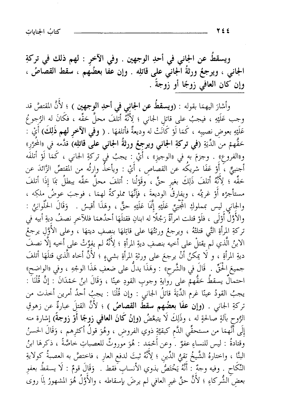 وأشار إليهما بقوله "ويسقط عن الجاني في أحد الوجهين" لأن المقتص قد وجب عليه فيجب على قاتل الجاني لأنه أتلف محل حقه فكان له الرجوع عليه بعوض نصيبه كما لو كانت له وديعة فأتلفها "وفي الآخر لهم ذلك" أي حقهم من الدية "في تركة الجاني و يرجع ورثة الجاني على قاتله" قدمه في "المحرر" و"الفروع" وجزم به في "الوجيز" أي يجب في تركة الجاني كما لو أتلفه أجنبي أو عفا شريكه عن القصاص أي ويأخذ وارثه من المقتص الزائد عن حقه لأنه أتلف ذلك بغير حق وقولنا أتلف محل حقه يبطل بما إذا أتلف مستأجره أو غريمه ويفارق الوديعة فإنها مملوكة لهما فوجب عوض ملكه والجاني ليس بمملوك المجني عليه إنما عليه حق وهذا أقيس وقال الحلواني والأول أولى فلو قتلت امرأة رجلا له ابنان فقتلها أحدهما فللآخر نصف دية أبيه في تركة المرأة التي قتلته ويرجع ورثتها على قاتلها بنصف ديتها وعلى الأول يرجع الابن الذي لم يقتل على أخيه بنصف دية المرأة لأنه لم يفوت على أخيه إلا نصف دية المرأة و لا يمكن أن يرجع على ورثة المرأة بشيء لأن أخاه الذي قتلها أتلف جميع الحق قال في "الشرح" وهذا يدل على ضعف هذا الوجه وفي الواضح احتمال يسقط حقهم على رواية وجوب القود عينا وقال ابن حمدان إن قلنا يجب القود عينا غرم الدية قاتل الجاني وإن قلنا يجب أحد أمرين أخذت من تركة الجاني "وإن عفا بعضهم سقط القصاص" لأن القتل عبارة عن زهوق الروح بآلة صالحة له وذلك لا يتبعض "وإن كان العافي زوجا أو زوجة" إشارة منه إلى أنهما من مستحقي الدم كبقية ذوي الفروض وهو قول أكثرهم وقال الحسن وقتادة ليس للنساء عفو وعن أحمد هو موروث للعصبات خاصة ذكرها ابن البنا واختاره الشيخ تقي الدين لأنه ثبت لدفع العار فاختص به العصبة كولاية النكاح وفيه وجه أنه يختص بذوي الأنساب فقط وقال قوم لا يسقط بعفو بعض الشركاء لأن الحق غير العافي لم يرض بإسقاطه والأول هو المشهور لما روى