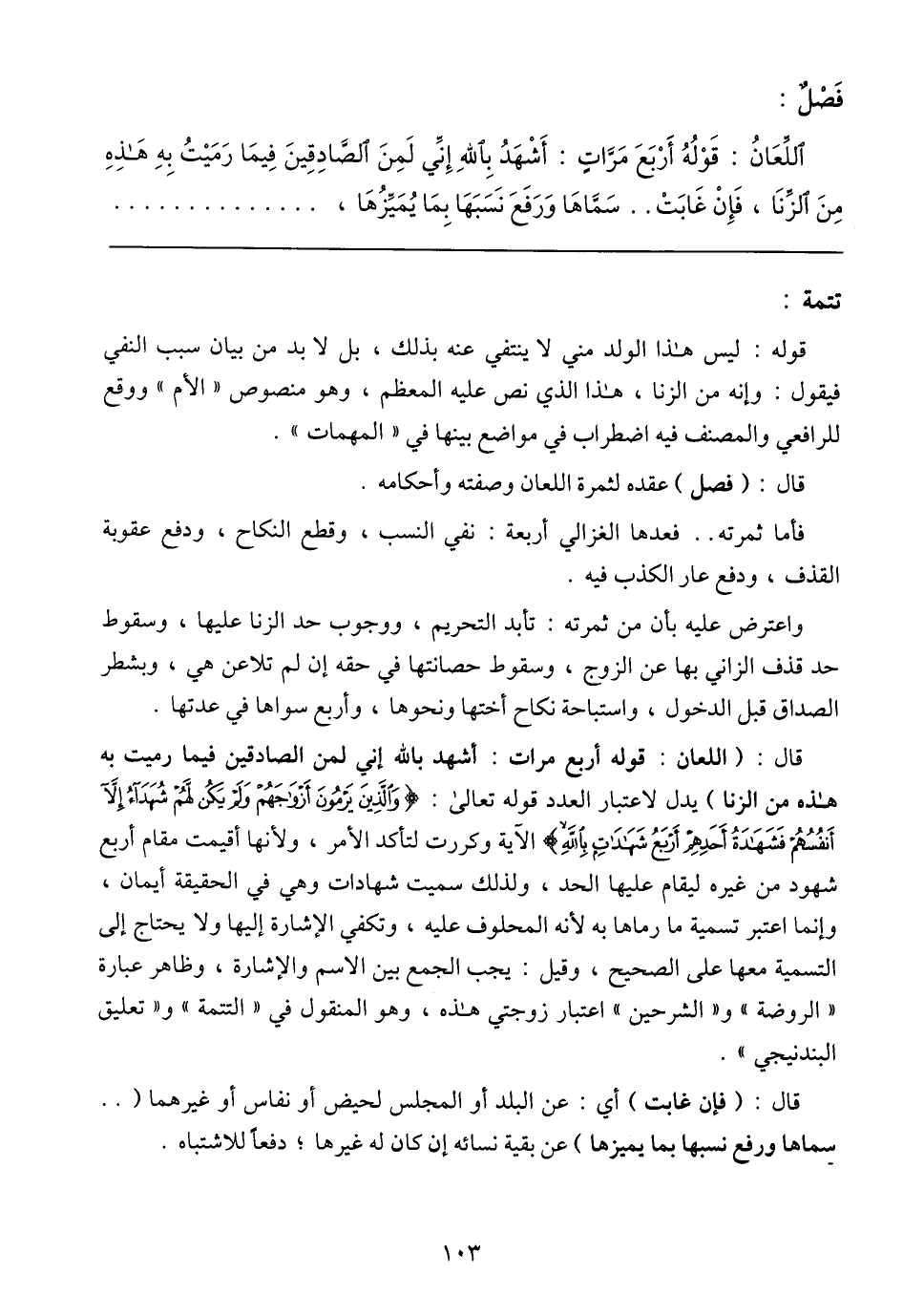 اللِّعَانُ: قَوْلُهُ أَرْبَعَ مَرَّاتٍ أَشْهَدُ بِاللهِ إِنِّي لَمِنَ الصَّادِقِينَ فِيمَا رَمَيْتُ بِهِ هَذِهِ مِنَ الزِّنَا، فَإِنْ غَابَتْ .. سَمَّاهَا وَرَفَعَ نَسَبَهَا بِمَا يُمَيِّزُهَا،