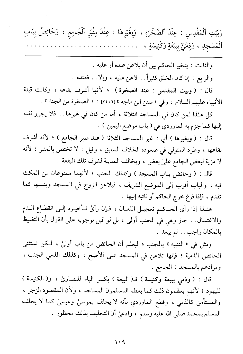 ومثل في (التنبيه) بالجنب؛ ليعلم أن الحائض من باب أولى، لكن تستثنى الحائض الذمية؛ فإنها تلاعن في المسجد على الأصح، وكذلك الذمي الجنب، ومرادهم بالمسجد: الجامع.