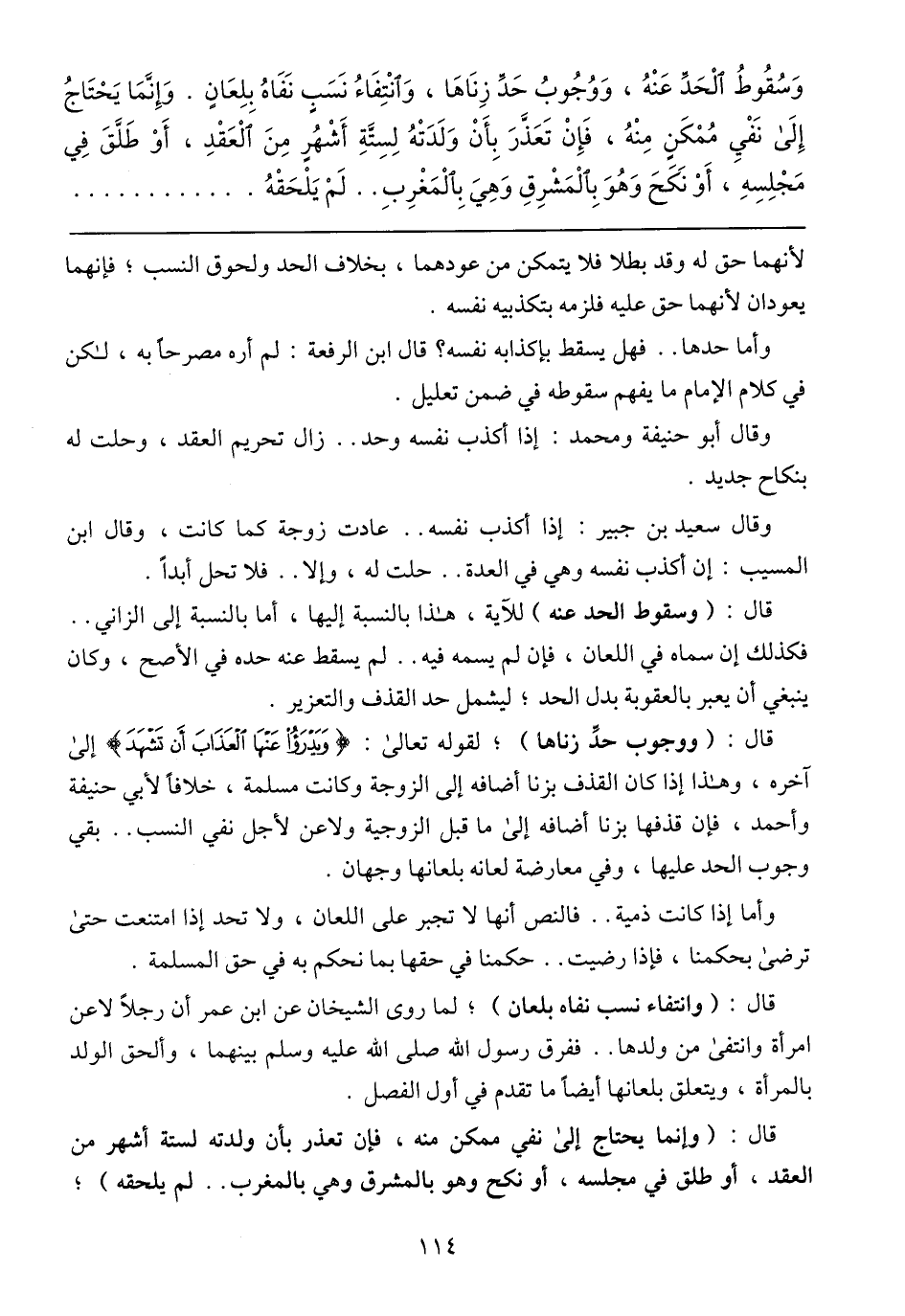 وَسُقُوطُ الْحَدِّ عَنْهُ، وَوُجُوبُ حَدِّ زِنَاهَا، وَانْتِفَاءُ نَسَبٍ نَفَاهُ بِلِعَانٍ. وَإِنَّمَا يَحْتَاجُ إِلَى نَفْىِ مُمْكَنٍ مِنْهُ، فَإِنْ تَعَذَّرَ بِأَنْ وَلَدَتْهُ لِسِتَّةِ أَشْهُرٍ مِنَ العَقْدِ، أَوْ طَلَّقَ فِي مَجْلِسِهِ، أَوْ نَكَحَ وَهُوَ بِالْمَشْرِقِ وَهِيَ بِالْمَغْرِبِ .. لَمْ يَلْحَقْهُ
