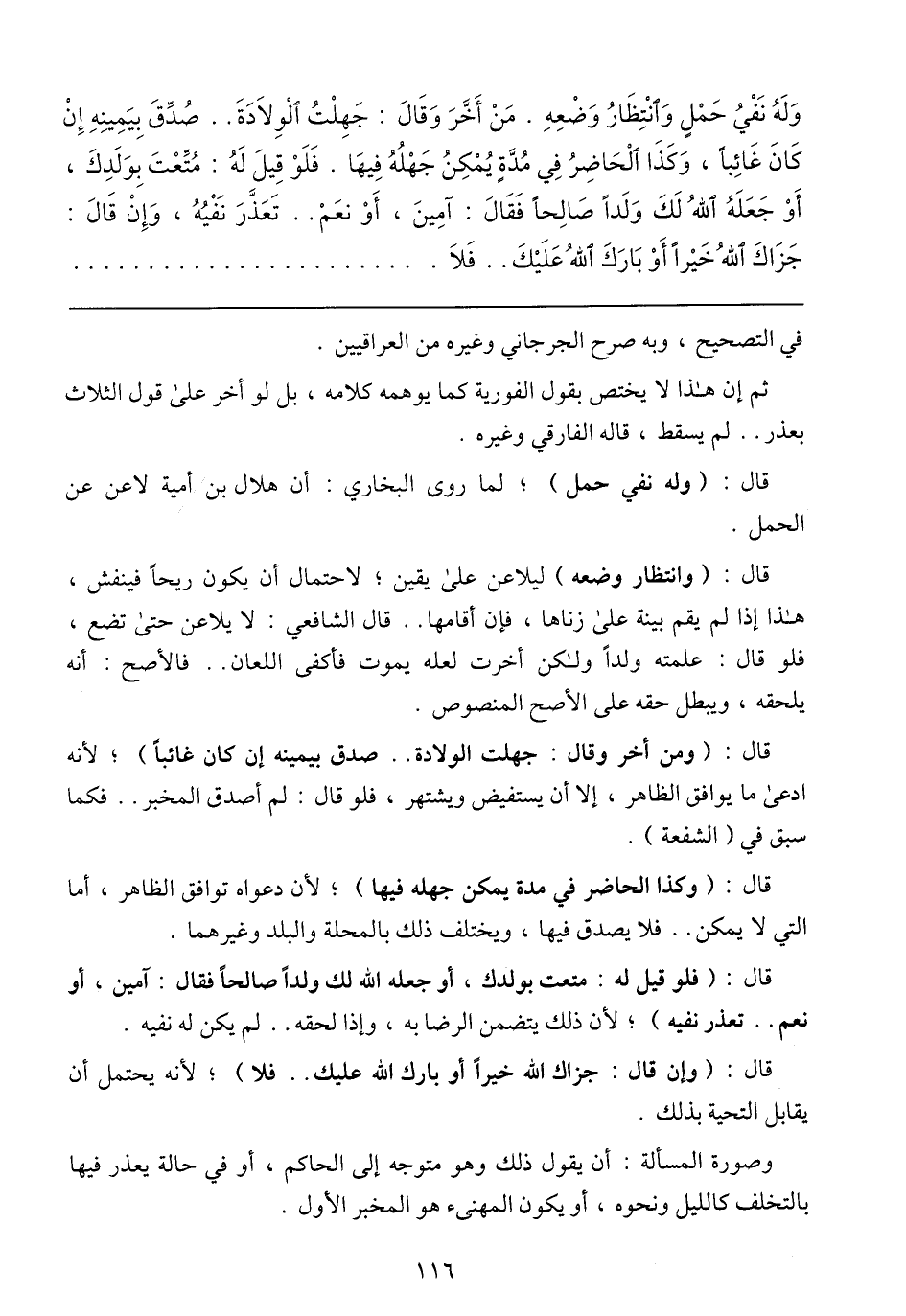 وَلَهُ نَفْيُ حَمْلٍ وَانْتِظَارُ وَضْعِهِ. مَنْ أَخَّرَ وَقَالَ: جَهِلْتُ الْوِلَادَةَ .. صُدْقُ بِيَمِينِهِ إِنْ كَانَ غَائِبًا، وَكَذَا الْحَاضِرً فِي مُدَّةٍ يُمْكِنُ جَهْلُهُ فِيهَا. فَلَوْ قِيلَ لَهُ: مُتِّعْتَ بِوَلَدِكَ، أَوْ جَعَلَهُ اللهُ لَكَ وَلَدًا صَالِحًا فَقَالَ: آمِينَ، أَوْ نعَمْ .. تَعَذَّرَ نَفْيُهُ، وَإِنْ قَالَ: جَزاكَ اللهَ خَيْرًا أَوْ بَارَكَ اللهَ عَلَيْكَ .. فَلَا