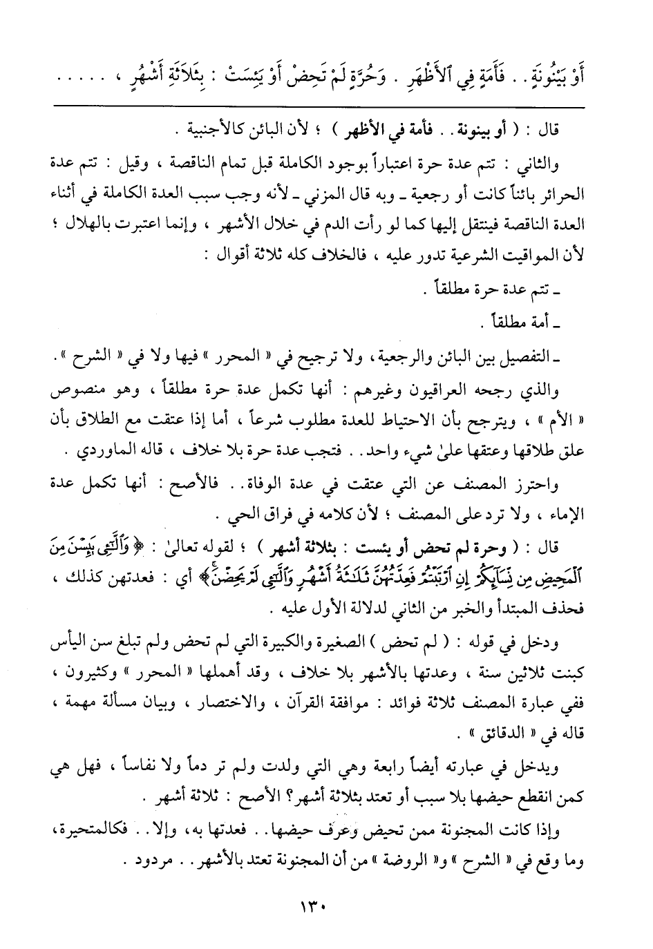 قال: (وحرة لم تحض أو يئست: بثلاثة أشهر)؛ لقوله تعالى: {واللاَّئِي يَئِسْنَ مِنَ المَحِيضِ مِن نِّسَائِكُمْ إنِ ارْتَبْتُمْ فَعِدَّتُهُنَّ ثَلاثَةُ أَشْهُرٍ واللاَّئِي لَمْ يَحِضْنَ} أي: فعدتهن كذلك, فحذف المبتدأ والخبر من الثاني لدلالة الأول عليه.