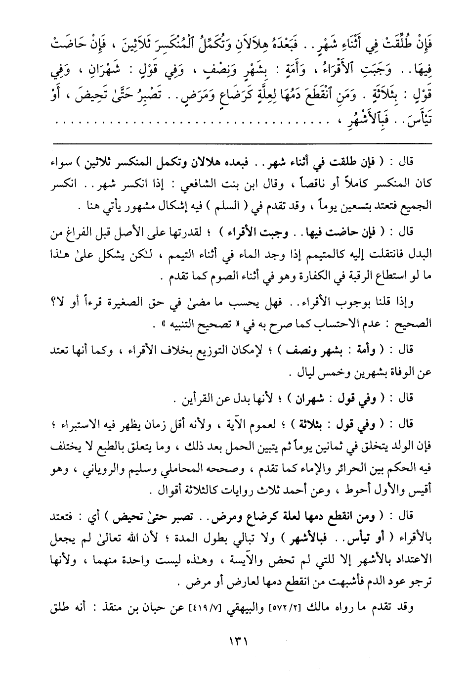 فَإِن طُلِّقَت فِي أَثنَاءِ شَهرٍ .. فَبعدَهُ هِلاَلاَنِ وَتُكمِلُ المُنكَسِرَ ثَلاثِينَ, فَإِن حَاضَت فِيهَا .. وَجَبَتِ الأقرَاءُ, وَأمَةٍ: بِشَهرٍ وَنِصفٍ, وفي قَولٍ: شَهرَانِ, وَفِي قَولٍ: بِثَلاثًةٍ. وَمَنِ انقَطَعَ دَمُهَا لِعِلَّةٍ كَرَضَاعٍ وَمَرَض ٍ .. تَصبِرُ حَتَّى تَحِيضُ, أَو تَيأَسَ .. فَبِالأشهُرِ,