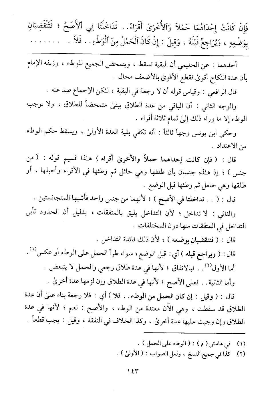 فَإِنْ كَانَتْ إِحْدَاهُمَا حَمْلًا وَالأَخْرَى اَقْرَاءً .. تَدَاخَلَتَا فِي الأَصَحِّ؛ فَتَنْقَضِيَانِ بِوَضْعِهِ، وَيُرَاجِعُ قَبْلَهُ، وَقِيلَ: إِنْ كَانَ الْحَمْلُ مِنَ الْوَطْءِ .. فَلَا