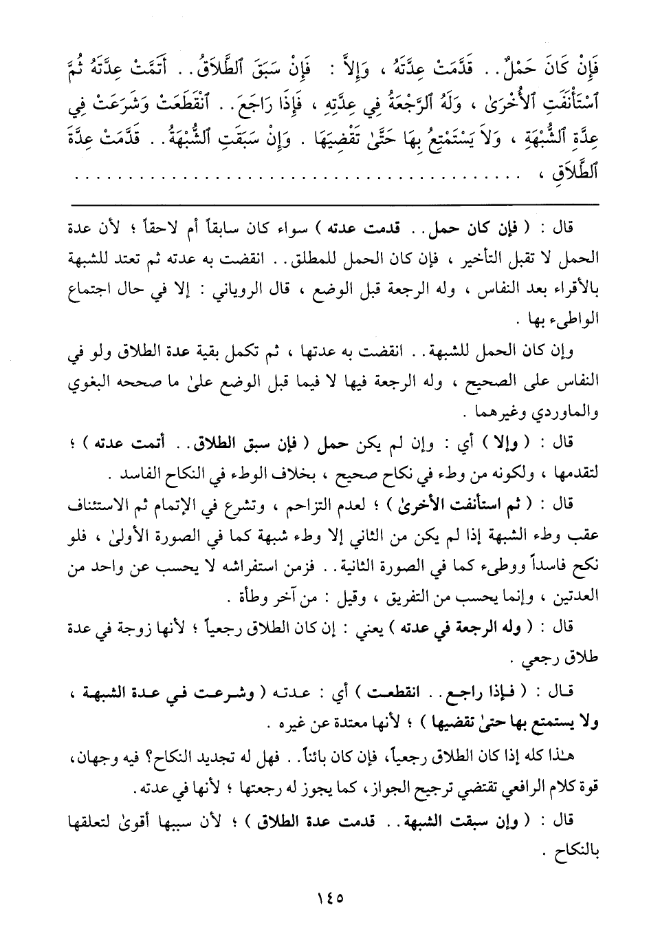فَإِنْ كَانَ حَمْلٌ .. قَدَّمَتْ عِدَّتَهُ، وَإِلاَّ: فَإِنْ سَبَقَ الطَّلاَقُ .. أَتَمَّتْ عِدَّتَهُ ثُمَّ اسْتَانَفَتِ الأُخْرَى، وَلَهُ الرَّجْعَةُ فِي عِدَّتِهِ، فَإِذَا رَاجَعَ .. انْقَطَعَتْ وَشَرَعَتْ فِي عِدَّةِ الشُّبْهَةِ، وَلاَ يَسْتَمْتِعُ بِهَا حَتَّى تَقْضِيَهَا. وَإِنْ سَبَقَتِ الشُّبْهَةُ .. قَدَّمَتْ عِدَّةَ الطَّلاَقِ،