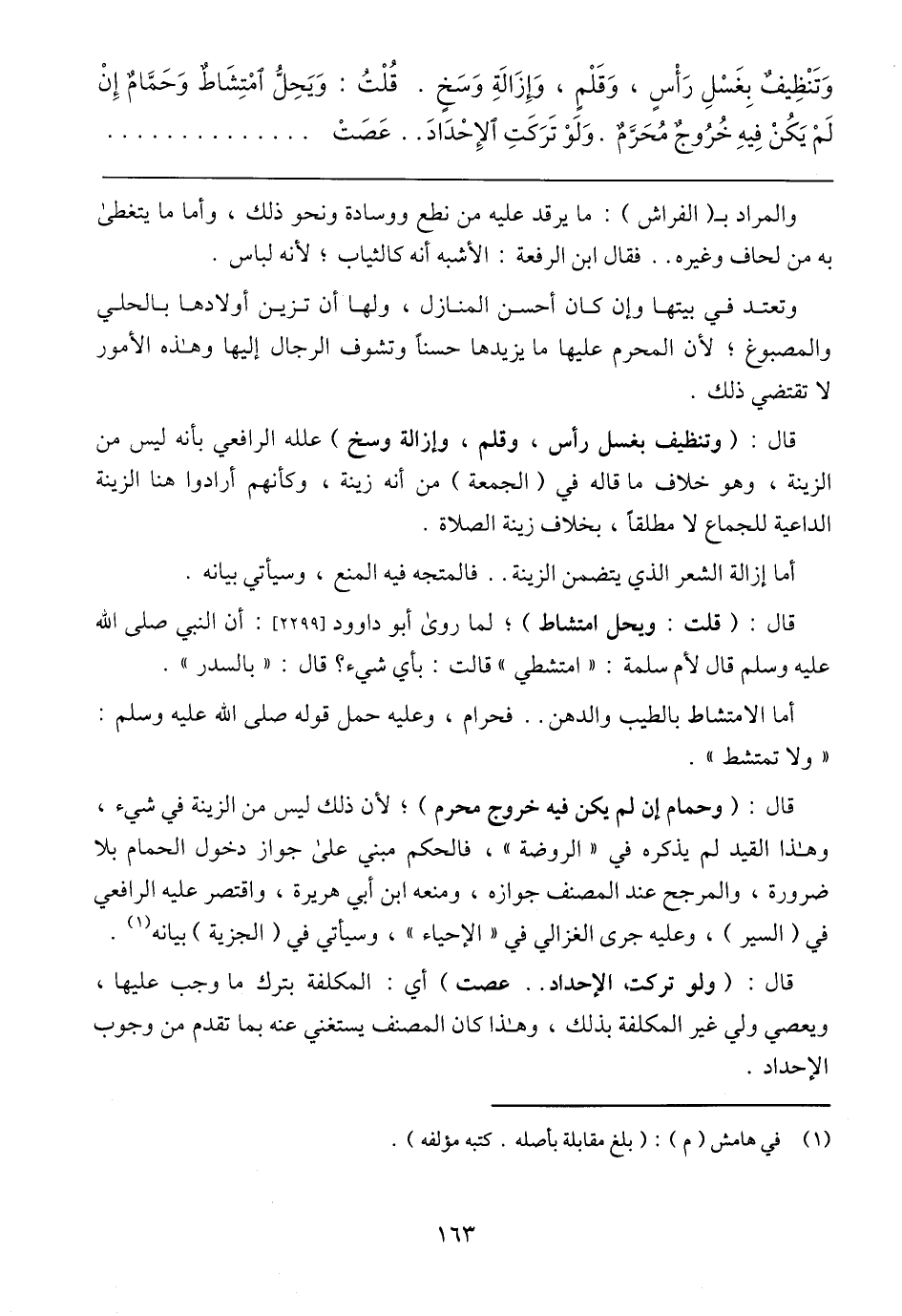 قال صلى الله عليه وسلم (وحمام إن لم يكن فيه خروج محرم)، لان ذلك ليس من الزينة في شي، وهذا القيد لم يذكره في) الروضة)، فالحكم مبني علي جواز دخول الحمام بلا ضرورة، والمرجح عند المنصف جوازه، ومنعه ابن أبي هريرة، واقتصر علية الرافعي في (السير)، وعلية جري الغزالي في) الإحياء)، وسيأتي في (الجزية) بيانه (1).