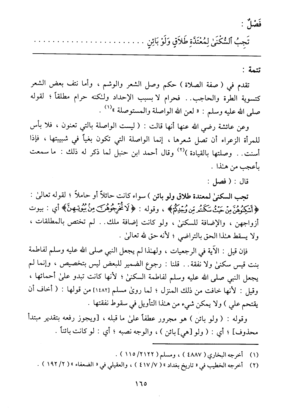 فان قبل: الآية في الرجعيات, لهذا لم يجعل النبي صلى الله علية وسلم لفاطمة بنت قيس سكنى ولا نفقة .. قلنا: رجوع الضمير للبعض ليس بتخصيص , وإنما لم يجعل النبي صلى الله علية وسلم لفاطمة السكنى , لأنها كانت تبدوا على أحماتها , وقيل: لأنها خافت من ذلك المنزل , لما روي مسلم [1482] من قولها: (أخاف أن يقتحم على) ولا يمكن شيء من هذا التأويل في سقوط نفقتها