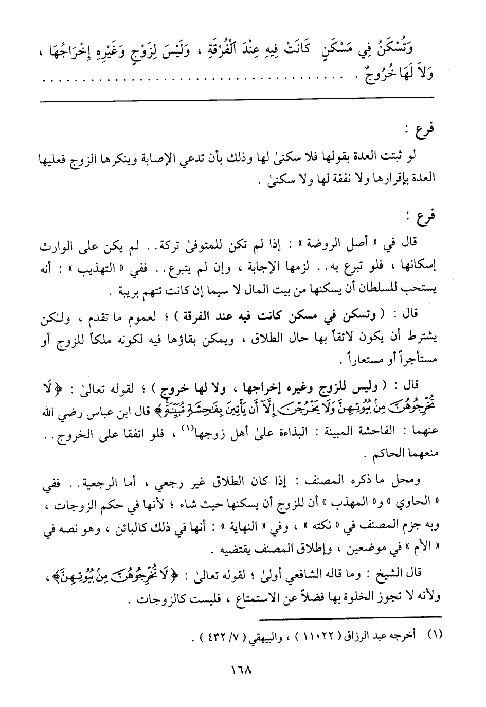 وَتُسْكَنُ فِي مَسْكَنٍ كَانَتْ فِيهِ عِنْدَ الْفُرْقَةِ، وَلَيْسَ لِزَوْجٍ وَغَيْرِةِ إِخْرَاجُهَا، وَلَا لَهَا خُرُوجٌ