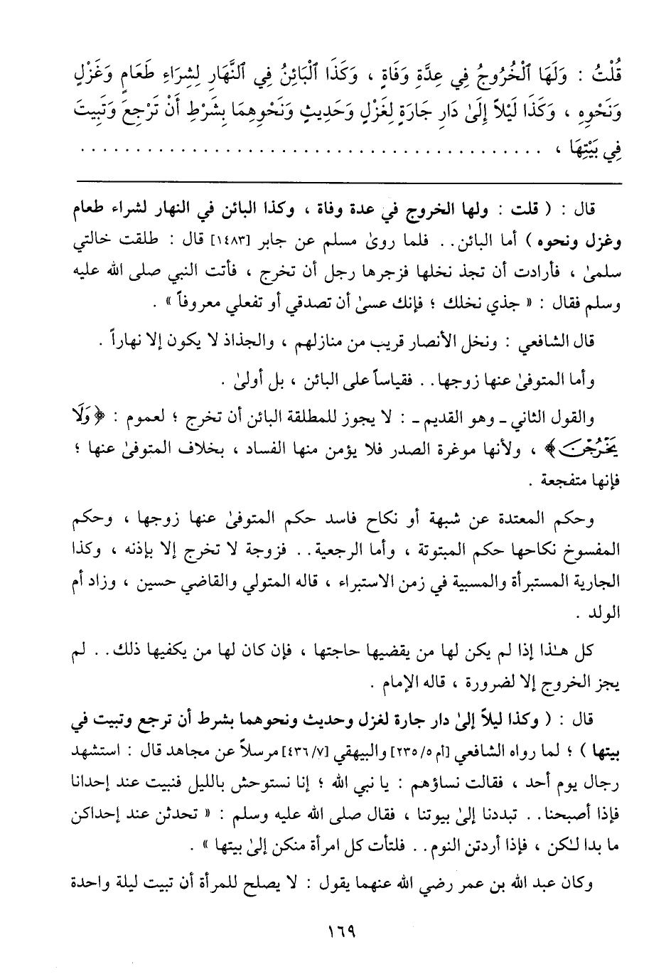 قال: (قلت: ولها الخروج في عدة وفاة , وكذا البائن لشراء طعام ونحوه) إما البائن .. فلما روي مسلم عن جابر {1483} قال: طلفت خالتى سلمى , فأرادت أن تجد نخلها فزجرها رجل إن تخرج, فاتت النبي صلى الله علية وسلم فقال:) خذي نخلك , فانك عسى أن تصدقي أو تفعلي معروفا)
