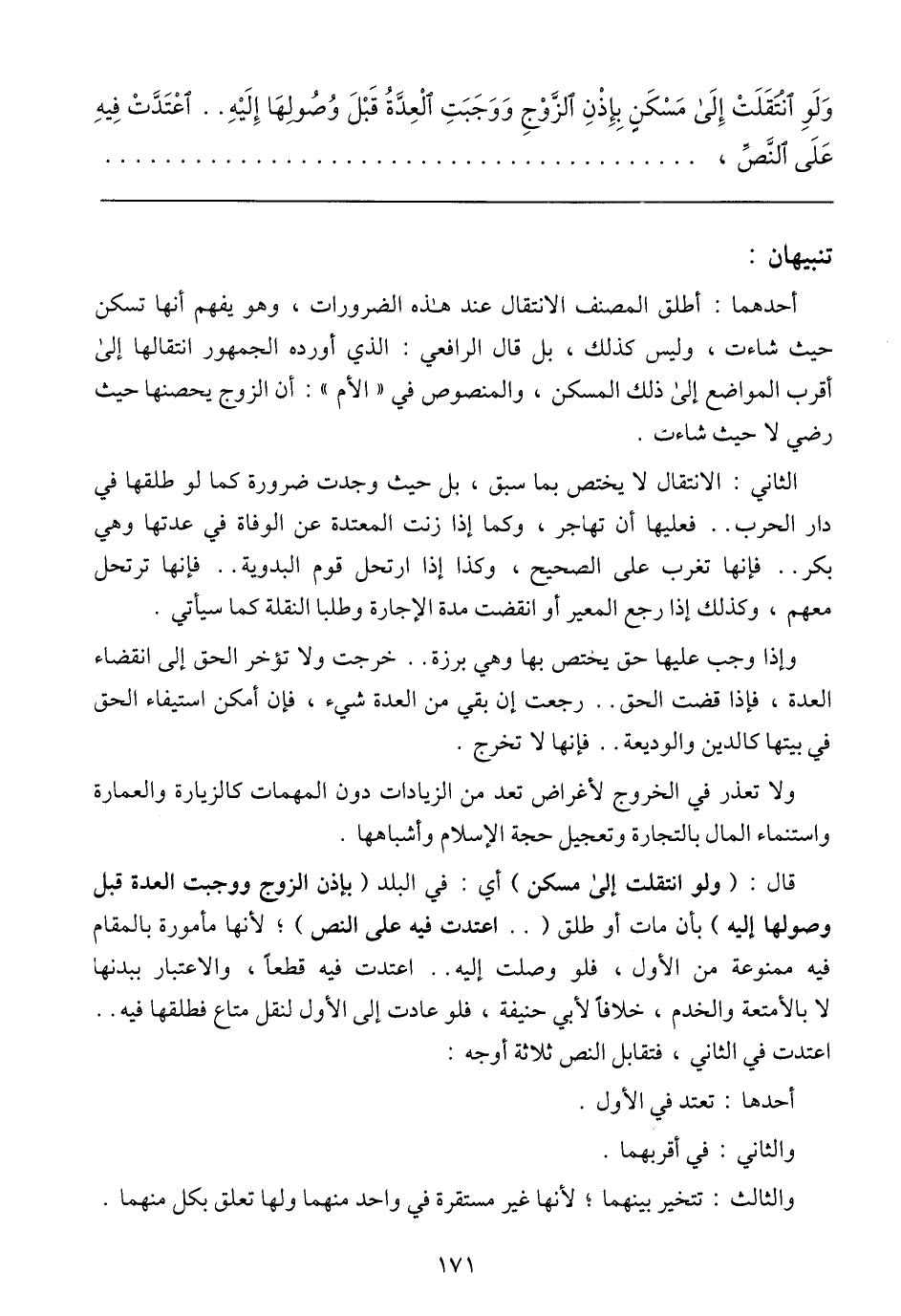 الثاني: الانتقال لا يختص بما سبق، بل حيث وجدت ضرورة كما لو طلقها في دار الحرب .. فعليها أن تهاجر، وكما إذا زنت المعتدة عن الوفاة في عدتها وهر بكر .. فإنها تغرب على الصحيح، وكذا إذا ارتحل قوم البدوية .. فإنها ترتحل معهم، وكذلك إذا رجع المعير أو انقضت مدة الإجازة وطلبا النقلة كما سيأتي.