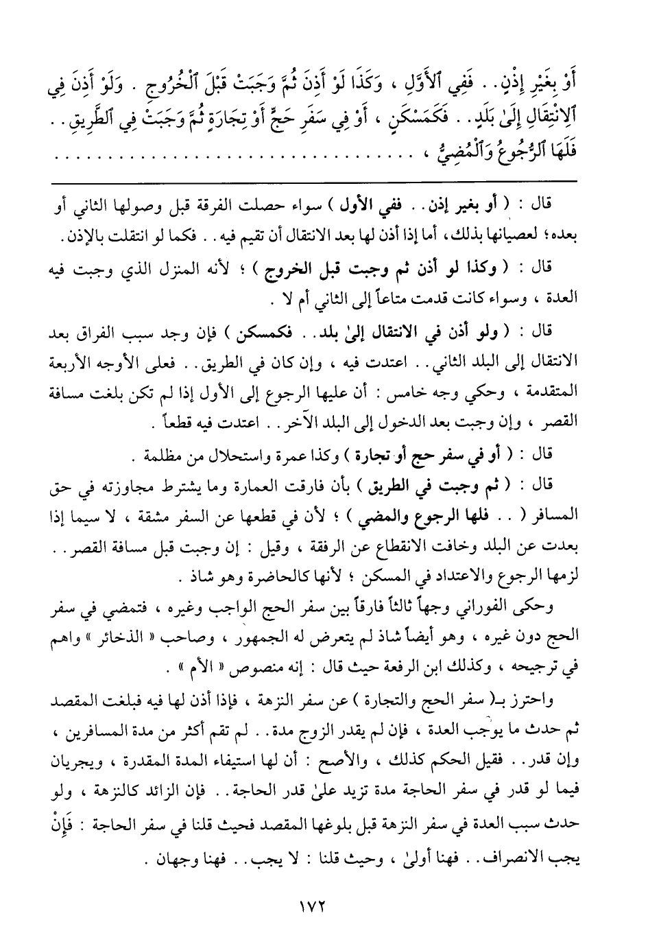 أَوْ بِغَيْرِ إذْنٍ .. فَفِي الأَوَّلِ، وَكَذَا لَوْ أَذِنَ ثُمَّ وَجَبَتْ قَبْلَ الْخُرُوجِ. وَلَوْ أَذِنَ فِي الاِنْتِقَالِ إَلَى بَلَدٍ .. فَكَمَسْكَنٍ، أَوْ فِي سَفَرِ حَجٍّ أَوْ تِجَارَةٍ ثُمَّ وَجَبَتْ فِي الطَّرِيقِ .. فَلَهَا الرُّجُوعُ وَالْمُضِيُّ،