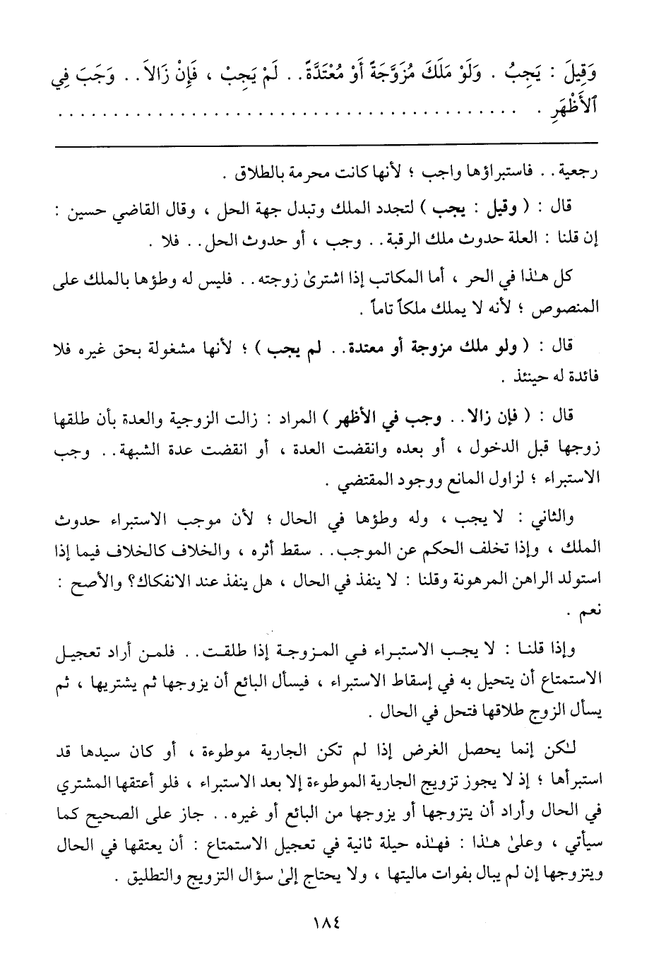 لكن إنما يحصل الغرض إذا لم تكن الجارية موطوءة، أو كان سيدها قد استبرأها؛ إذ لا يجوز تزويج الجارية الموطوءة إلا بعد الاستبراء، فلو أعتقها المشتري في الحال وأراد أن يتزوجها أو يزوجها من البائع أو غيره .. جاز على الصحيح كما سيأتي، وعلى هذا: فهذه حيلة ثانية في تعجيل الاستمتاع: أن يعتقها في الحال ويتزوجها إن لم يبال بفوات ماليتها، ولا يحتاج إلى سؤال التزويج والتطليق.