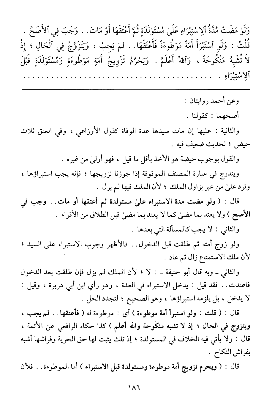 وَلَوْ مَضَتْ مُدَّةُ الاِسْتِبْرِاءِ عَلَى مُسْتَوْلَدَةٍ ثُمَّ أَعْتَقَهَا أَوْ مَاتَ .. وَجَبَ فِي الأَصَحِّ. قُلْتُ: وَلَوِ اسْتَبْرَأَ أَمَةً مَوْطُوءَةً فَأَعْتَقَهَا .. لمْ يَجِبْ، وَيَتَزَوَّجُ فِي الْحَالِ؛ إَذْ لاَ تُشْبِهُ مَنْكُوحَةً، وَاللهُ أَعْلَمُ. وَيَحْرُمُ تَزْوِيجُ أَمَةٍ مَوْطُوءَةٍ وَمُسْتَوْلَدَةٍ قَبْلَ الاِسْتِبْرَاءِ