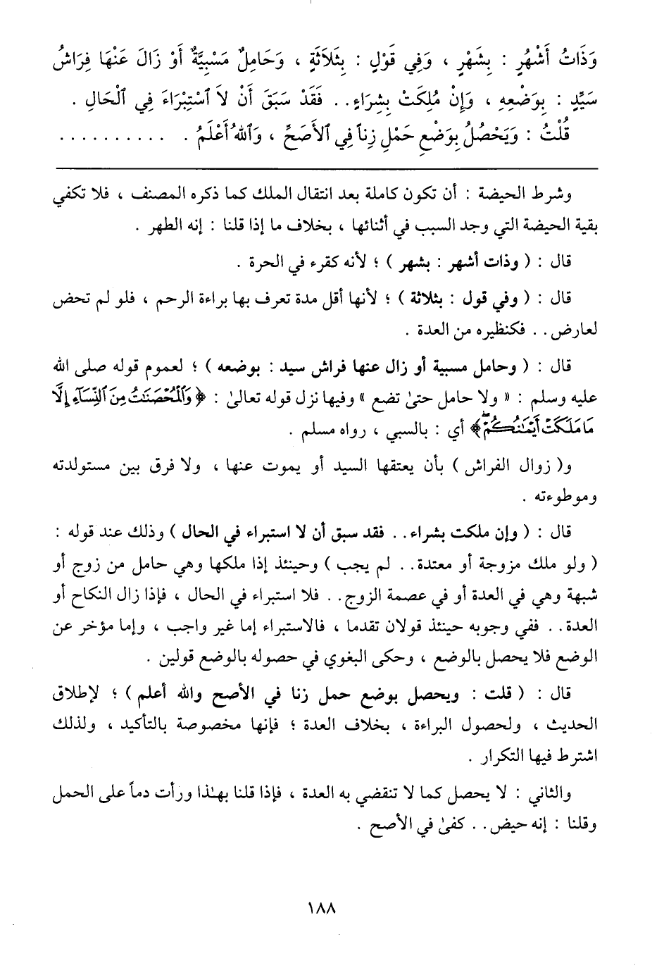 قال: (وحامل مسبية أو زال عنها فراش عنها فراش سيد: بوضعه)؛ لعموم قوله صلى الله عليه وسلم: (ولا حامل حتى تضع) وفيها نزل قوله تعالى) {وَالْمُحْصَنَتُ مِنَ النِّسَآء إِّلَّا مَأ مَلَكَتْ أَيْمَنكُمْ} أي: بالسبي، رواه مسلم.