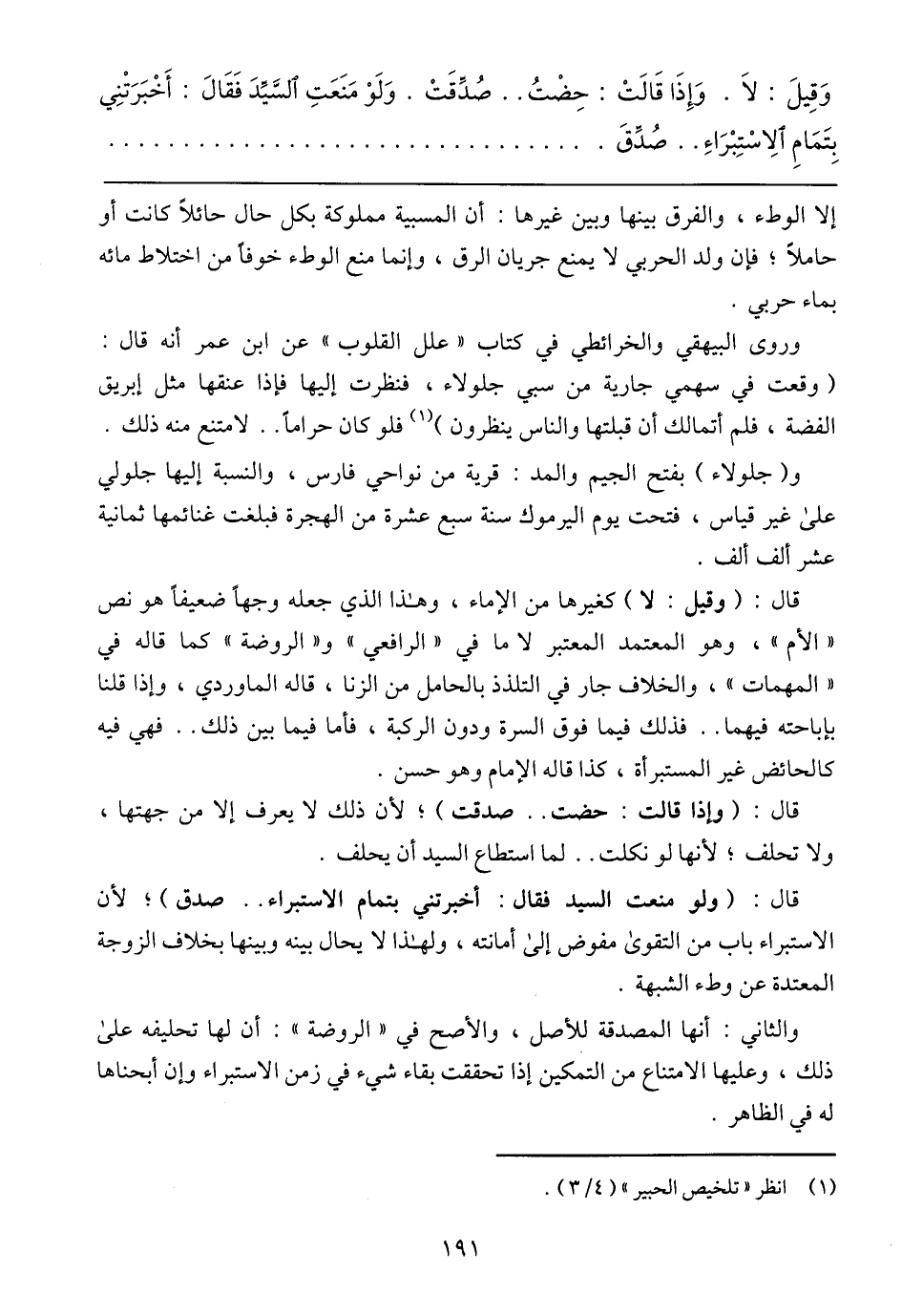 والثانى: أنها المصدقه للأصل , والأصح فى (الروضة):أن لها تحليفه على ذلك , وعليها الإمتناع من التمكين إذا تحققت بقاء شيء في زمن الإستبراء وإن أبحناها له في الظاهر.