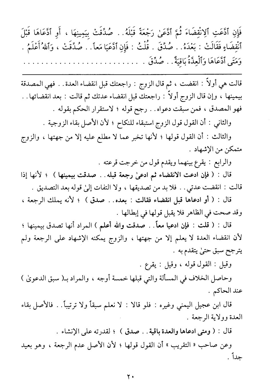 قالت هي أولًا: انقضت، ثم قال الزوج: راجعتك قبل انقضاء العدة .. فهي المصدقة بيمينها، وإن قال الزوج أولًا: راجعتك قبل انقضاء عدتك ثم قالت: بعد انقضائها .. فهو المصدق، فمن سبقت دعواه .. رجح قوله؛ لاستقرار الحكم بقوله:
