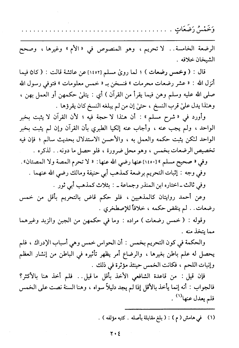 قال: (وخمس رضعات)؛ لما روى مسلم [1452] عن عائشة قالت: (كان فيما أنزل الله: (عشر رضعات محرمات) فنسخن بـ (خمس معلومات) فتوفي رسول الله صلى الله عليه وسلم وهن فيما يقرأ من القرآن) أي: يتلى حكمهن أو العمل بهن، وهذا يدل على قرب النسخ، حتى إن من لم يبلغه النسخ كان يقرؤها.