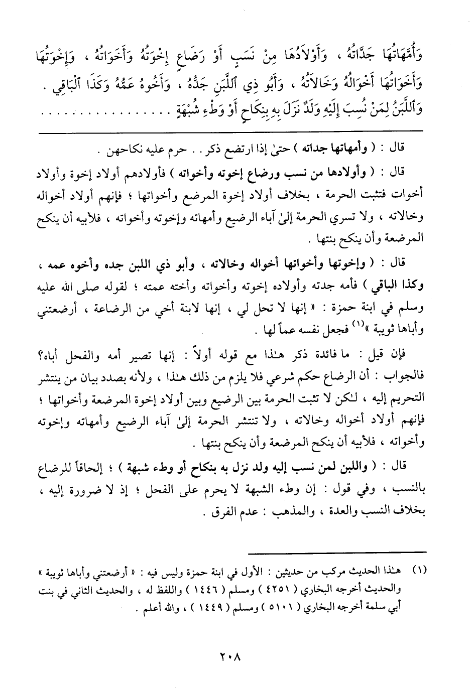 قال: (وأولادها من نسب ورضاع إخوته وأخواته) فأولادهم أولاد إخوة وأولاد أخوات فتثبت الحرمة، بخلاف أولاد إخوة المرضع وأخواتها؛ فإنهم أولاد أخواله وخالاته، ولا تسري الحرمة إلى آباء الرضيع وأمهاته وإخوته وأخواته، فلأبيه أن ينكح المرضعة وأن ينكح بنتها.