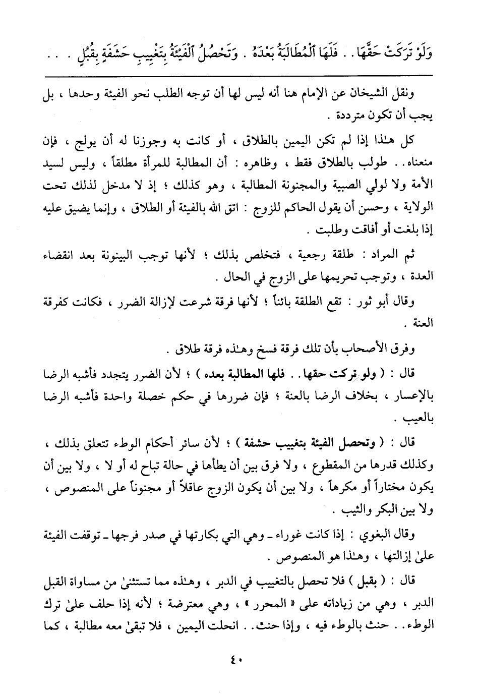 وَلَوْ تَرَكَتْ حَقَّهَا .. فَلَهَا المُطَالَبَةُ بَعْدَهُ. وَتَحْصُلُ الْفَيْئَةُ بِتَغْيِيبِ حَشَفَةٍ بِقُبُلٍ