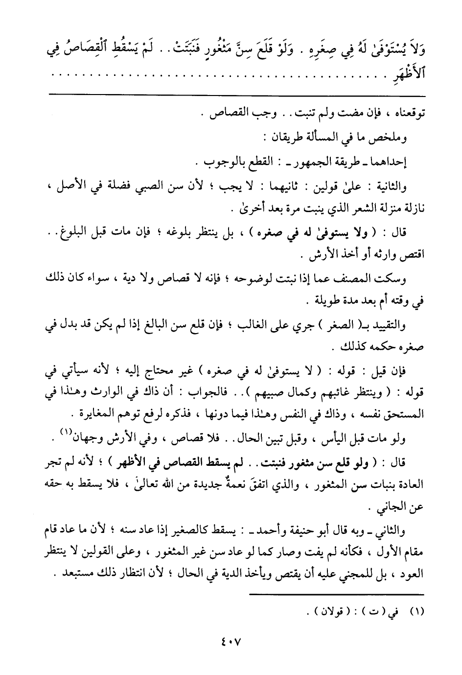 فإن قيل: قوله: (لا يستوفى له في صغره) غير محتاج إليه؛ لأنه سيأتي في قوله: (وينتظر غائبهم وكمال صبيهم) .. فالجواب: أن ذاك في الوارث وهذا في المستحق نفسه, وذاك في النفس وهذا فيما دونها, فذكره لرفع توهم المغايرة.