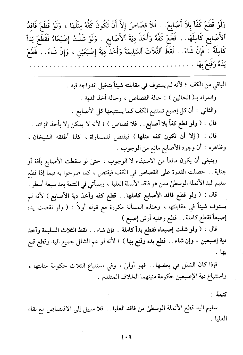 وينبغي أن يكون مانعًا من الاستيفاء لا الوجوب, حتى لو سقطت الأصابع بآفة أو جناية .. حصلت القدرة على القصاص في الكف فيقتص, كما صرحوا به فما إذا قطع سليم اليد الأنملة الوسطى ممن هو فاقد الأنملة العليا, وسيأتي في التتمة بعد سبعة أسطر.