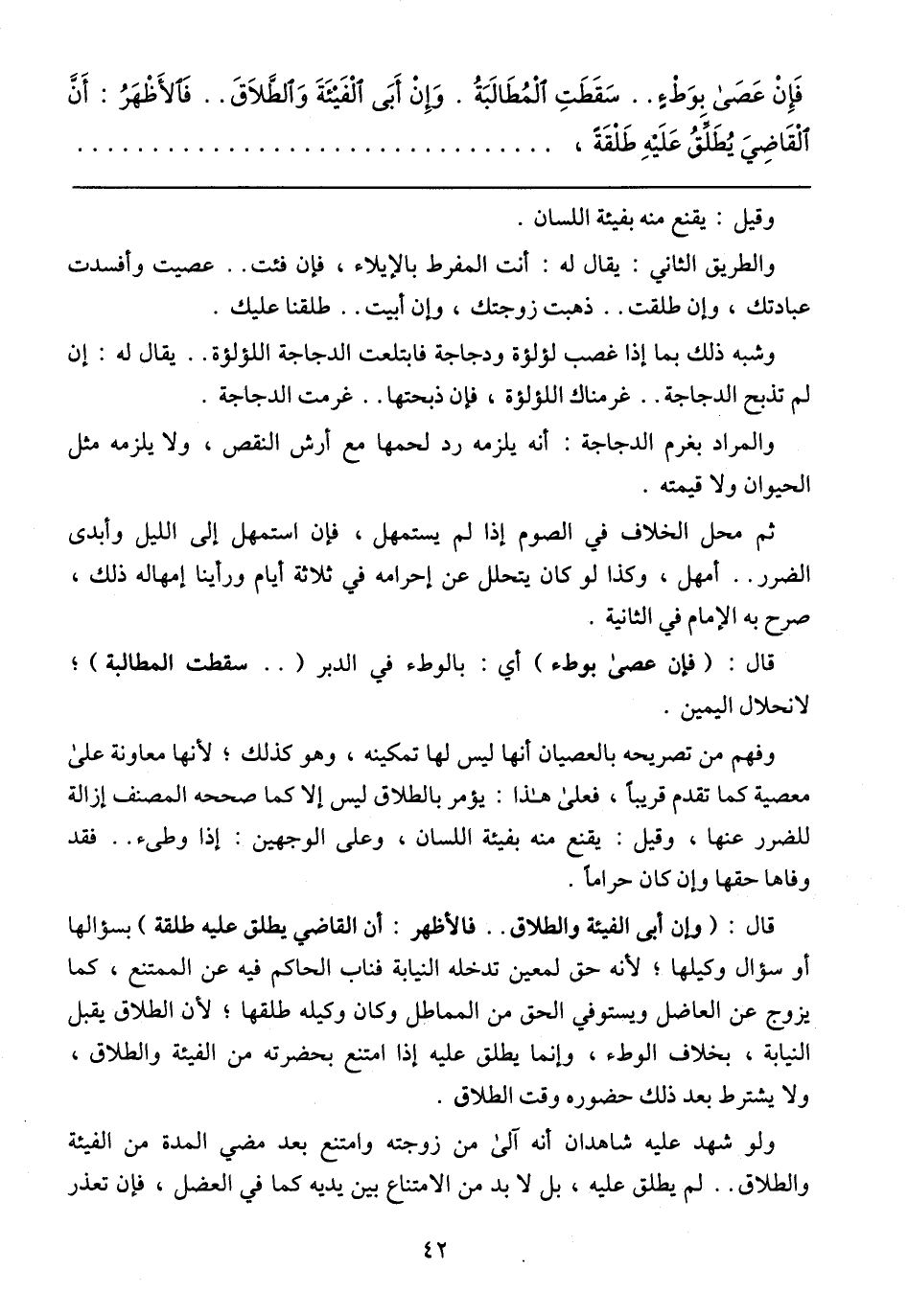 فَإِنْ عَصَى بِوَطْءٍ .. سَقَطَتِ الْمُطَالَبَةُ. وَإِنْ أَبَى الْفَيْئَةَ وَالطَّلَاقَ .. فَالأَظْهَرُ: أَنَّ الْقَاضِيَ يُطَلِّقُ عَلَيْهِ طَلْقَةً،