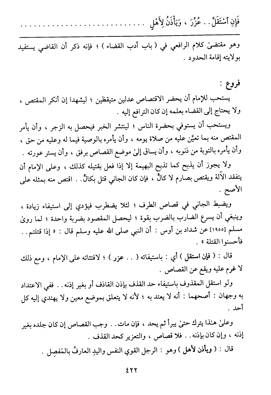 ويستحب أن يستوفي بحضرة الناس؛ لينتشر الخبر فيحصل به الزجر, وأن يأمر المقتص منه بما تعين عليه من صلاة يومه, وأن يأمره بالوصية فيما له وعليه من حق, وأن يأمره بالتوبة من ذنوبه, وأن يساق إلى موضع القصاص برفق, وأن يستر عورته.