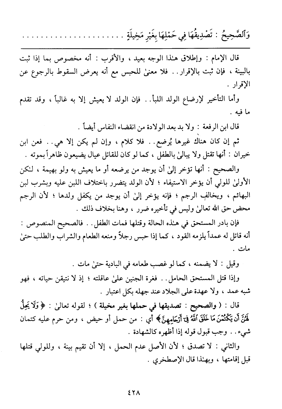 قال: (والصحيح تصديقها في حملها بغير مخيلة)؛ لقوله تعالى: {ولا يَحِلُّ لَهُنَّ أَن يَكْتُمْنَ مَا خَلَقَ اللَّهُ فِي أَرْحَامِهِنَّ} أي: من حمل أو حيض, ومن حرم عليه كتمان شيء .. وجب قبول قوله إذا أظهره كالشهادة.