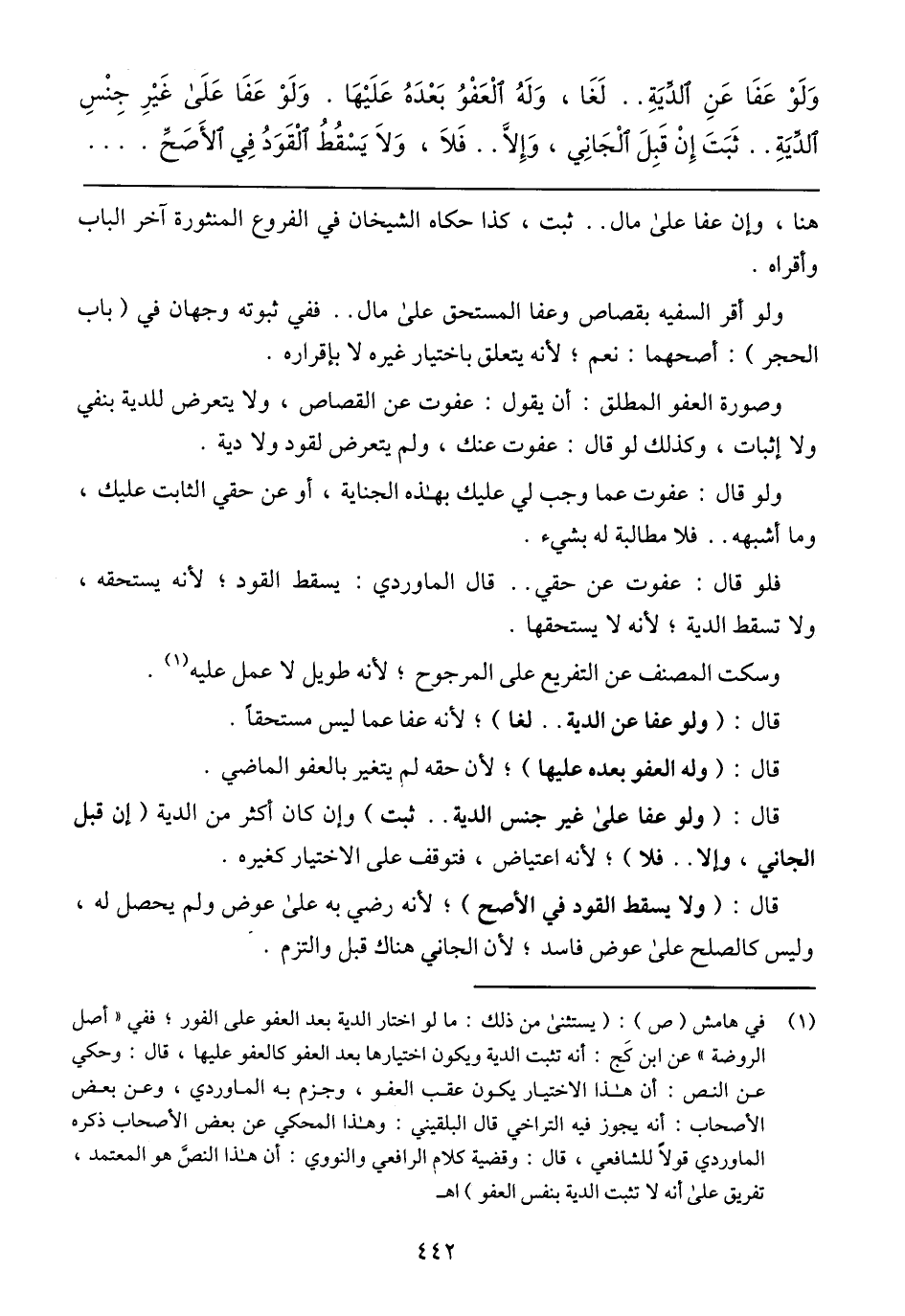 وَلَو عَفَا عَنِ اٌلدِيَةِ .. لَغَا, وَلَهُ اٌلعَفوُ بَعدَهُ عَلَيهَا. وَلَو عَفَا عَلَى غَيرِ جِنسٍ اٌلديةِ .. ثَبَتَ إن قَبِلَ الجَانِي, وَإلِا .. فَلاَ , وَلاَ يَسقُطُ القَودِ فِي اٌلأصَحِّ