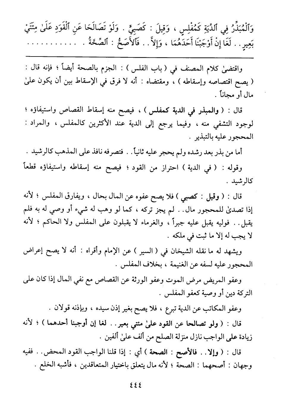 قال: (والمبذر في الدية كالمفلس) , فيصح منه إسقاط القصاص واستيفاؤه؛ لوجود التشفي منه , وفيما يرجع إلى الدية عند الأكثرين كالمفلس , والمراد: المحجور عليه بالتبذير.