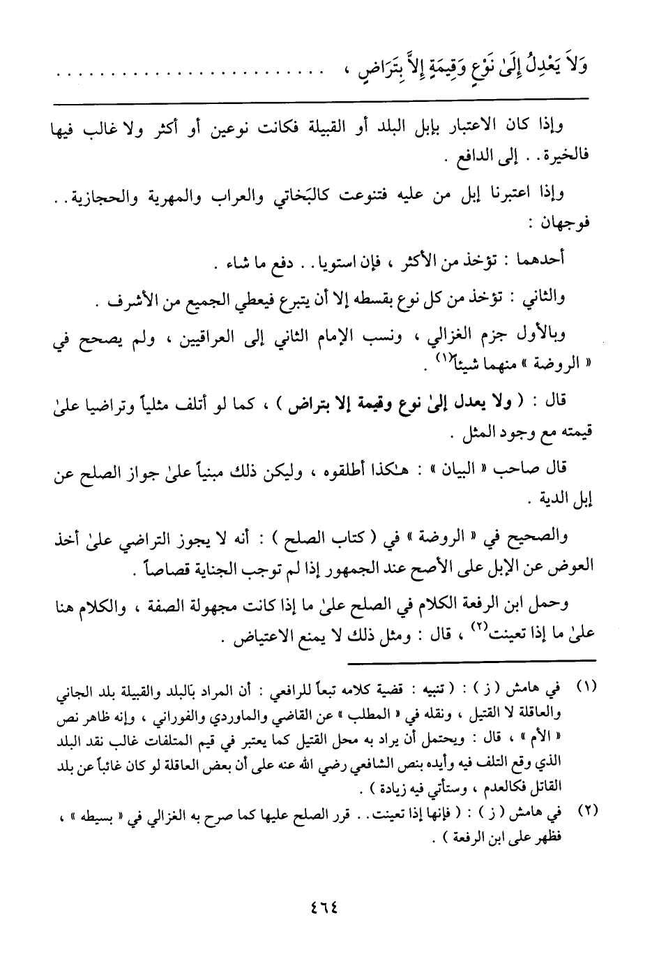 قال: (ولا يعدل إلى نوع وقيمة إلا بتراض)، كما لو أتلف مثليا وتراضيا على قيمته مع وجود المثل.