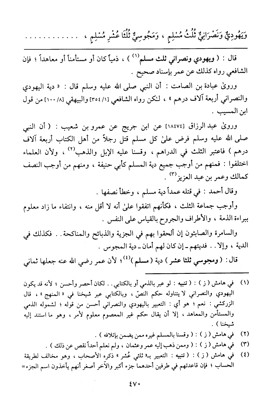قال: (ويهودي ونصراني ثلث مسلم)، ذميًا كان أو مستأمنًا أو معاهدًا؛ فإن الشافعي رواه كذلك عن عمر بإسناد صحيح.