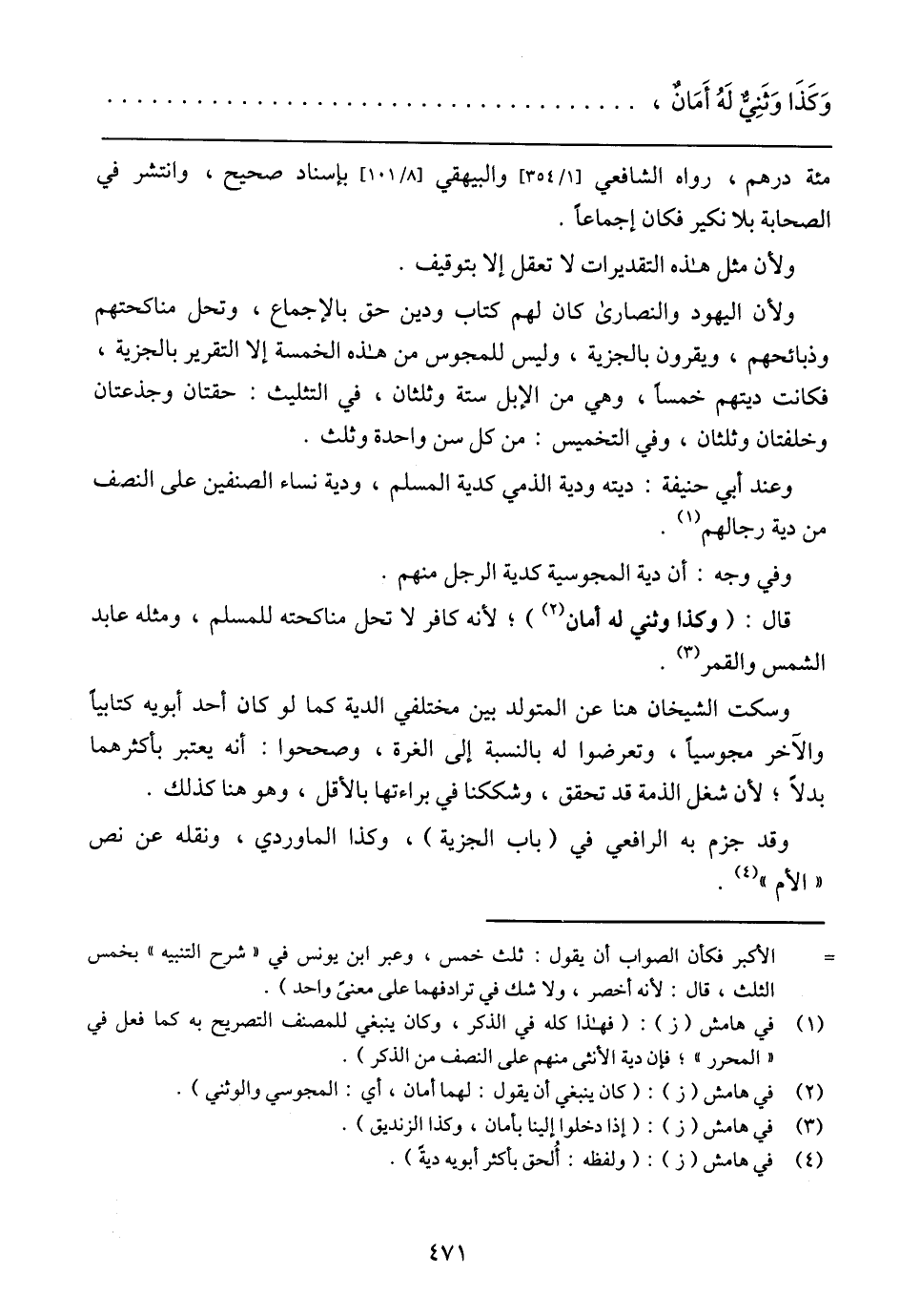 ولأن اليهود والنصارى كان لهم كتاب ودين حق بالإجماع، وتحل مناكحنهم وذبائحهم، ويقرن بالجزية، وليس للمجوس من هذه الخمسة إلا التقرير بالجزية، فكانت ديتهم خمسًا، وهي من الإبل ستة وثلثان، وفي التثليث: حقتان وجذعتان وخلفتان وثلثان، وفي التخميس: من كل سن واحدة وثلث.
