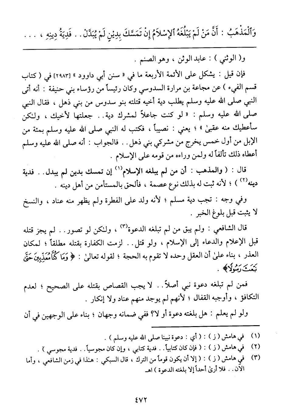 وَالمَذهبُ: أنَّ مَنْ لَم يبَلُغَهُ الإسلامُ إن تَمَسَّكَ بِدِيِنً لم يبدلَ .... فديةُ دِيِنِهِ،