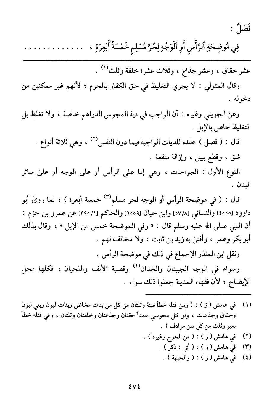 قال: (في موضحة الرأس أو الوجه لحر مسلم خمسة أبعرة)؛ لما روى أبو داوود [4555] والنسائي [8/ 57] وابن حبان [6559] والحاكم [1/ 395] عن عمرو بن حزم: أبو بكر وعمر، وأقتي به زيد بن ثابت، ولا موضحة لهم.