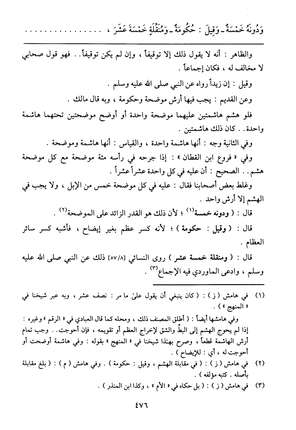 وفي (فروع ابن القطان): إذا جرحه في رأسه متة موضحة مع كل موضحة هشم ... الصحيح: أن عليه في كل واحدة عشرًا عشرًا.
