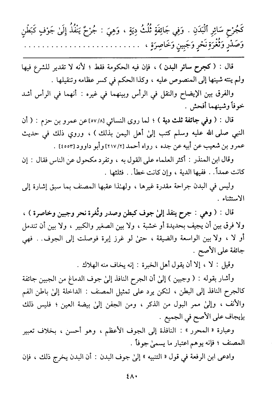 كَجُرْح سَأَئِر البُدُن. وَفِيَّ جائفة دِيَة، وَهِيَ: جَرَّحَ يُنْفَذ إِلَى جَوْف كَبَطْن وَصَدَرَ وَثُغْرَة نُحْر وَجَبِين وَخاصِرَة
