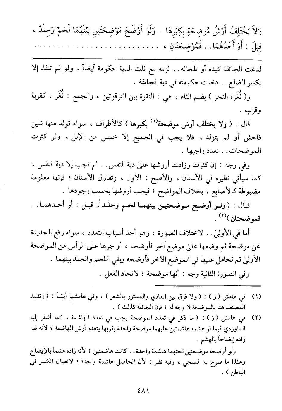 وَلا يَخْتَلِف أَرِش مُوَضِّحَة بِكُبْرها. وَلُو أُوضَح مُوَضِّحَتَيْنِ بَيَّنَها لَحَمَّ وَجِلْد، قِيلَ: أَو أَحَدّهُما .... فَمُوَضِّحَتَيْنِ،