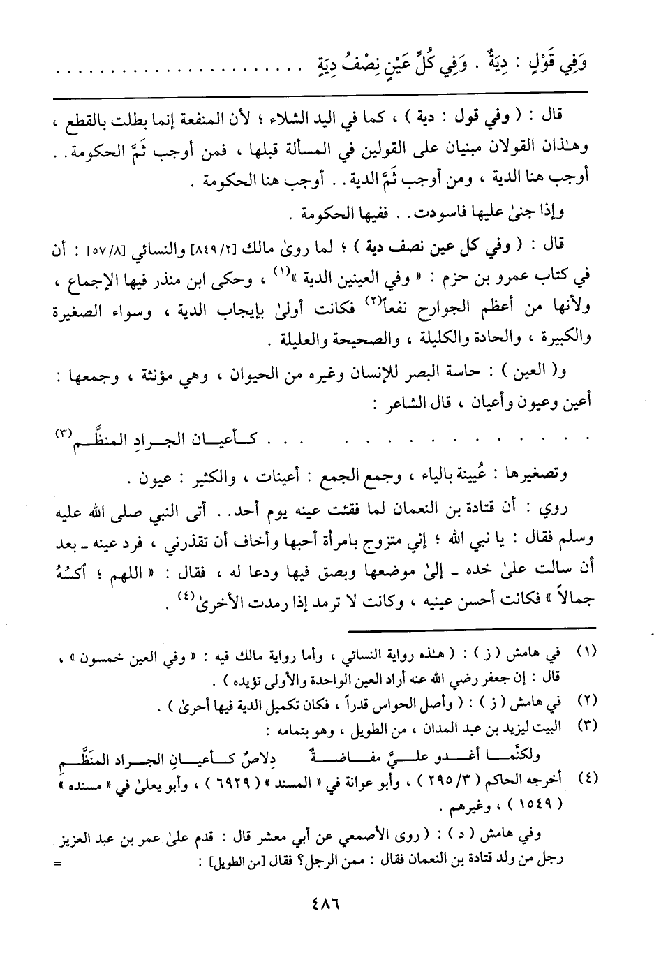 قال: (وفي كل عين نصف دية)؛ لما روى مالك [2/ 849] والنسائي [5/ 57]: أن في كتاب عمرو بن حزم: (وفي العينين الدية)، وحكي ابن منذر فيها الإجماع، ولأنها من أعظم الجوارح نفعا فكانت أولى بإيجاب الدية، وسواء الصغيرة والكبيرة، والحادة والكليلة، والصحيحة والعليلة.