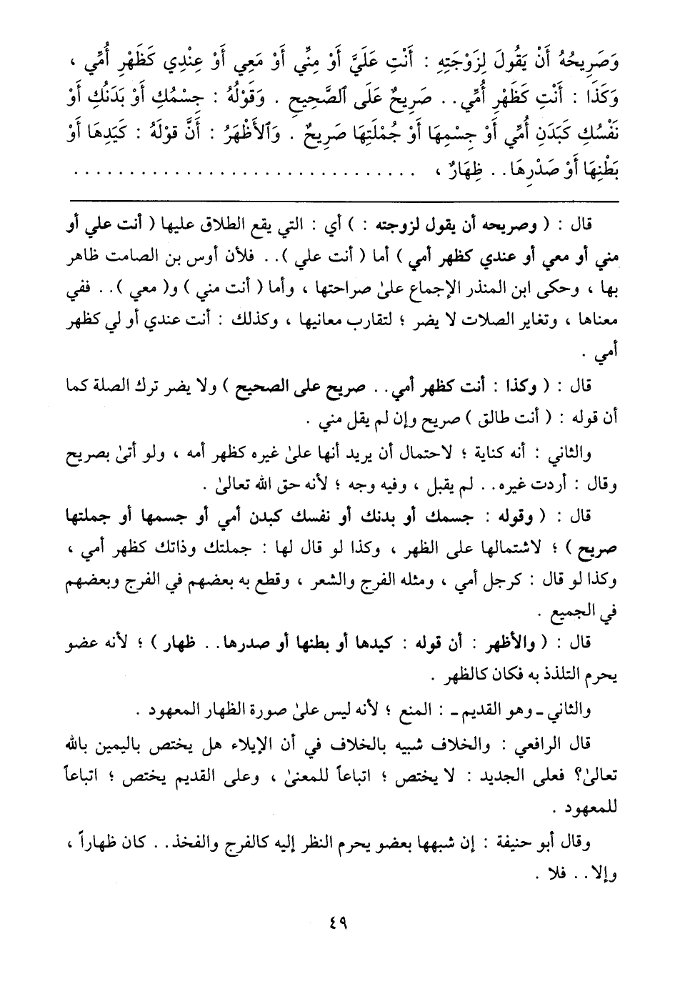 وَصَرِيحُهُ أَنْ يَقُولَ لِزَوْجَتِهِ: أَنْتِ عَلَىَّ أَوْ مِنِّى أَوْ مَعِي أَوْ عِنْدِي كَظَهْرِ أُمِّي، وَكَذَا: أَنْتِ كَظَهْرِ أُمِّى .. صَرِيحٌ عَلَى الصَّحِيحِ. وَقَوْلُهُ: جِسْمُكِ أَوْ بَدَنُكِ أَوْ نَفْسُكِ كَبَدَنِ أُمِّي أَوْ جِسْمِهَا أَوْ جُمْلَتِهَا صَرِيحٌ. وَالأَظْهَرُ: أَنَّ قَوْلَهُ: كَيَدِهَا أَوْ بَطْنِهَا أَوْ صَدْرِهَا .. ظِهَارٌ,