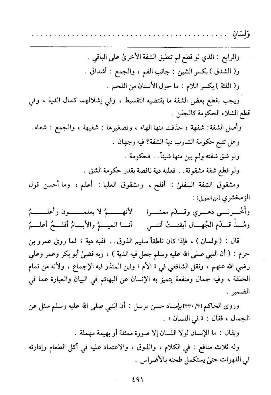 قال: (ولسان)، فإذا كان ناطقا سليم الذوق .... ففيه دية؛ لما روى عمرو بن حزم: (أن النبي صلى الله عليه وسلم جعل فيه الدية)، وبه قضي ابو بكر وعمر وعلي رضي الله عنهم، ونقل الشافعي في (الأم) وابن المنذر فيه الإجماع، ولأنه من تمام الخلقة، وفيه جمال ومنفعة يتميز به الإنسان عن البهائم في البيان والعبارة عما في الضمير.