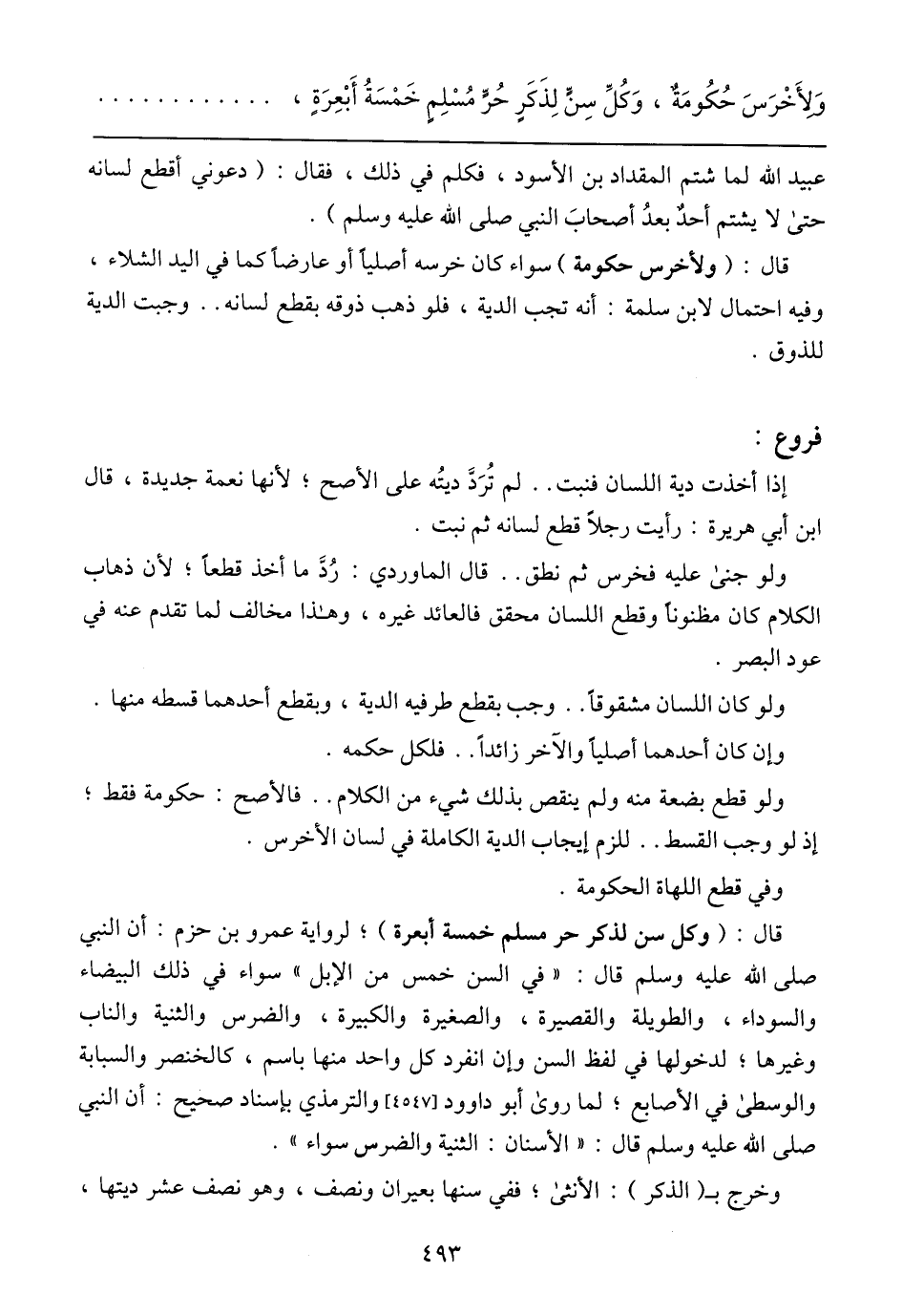 وَلِأَخْرَس حُكُومَة، وَكُلْ سَنّ لَذَكَّرَ حُرّ مُسْلِم خَمْسَة أَبْعِرَة،