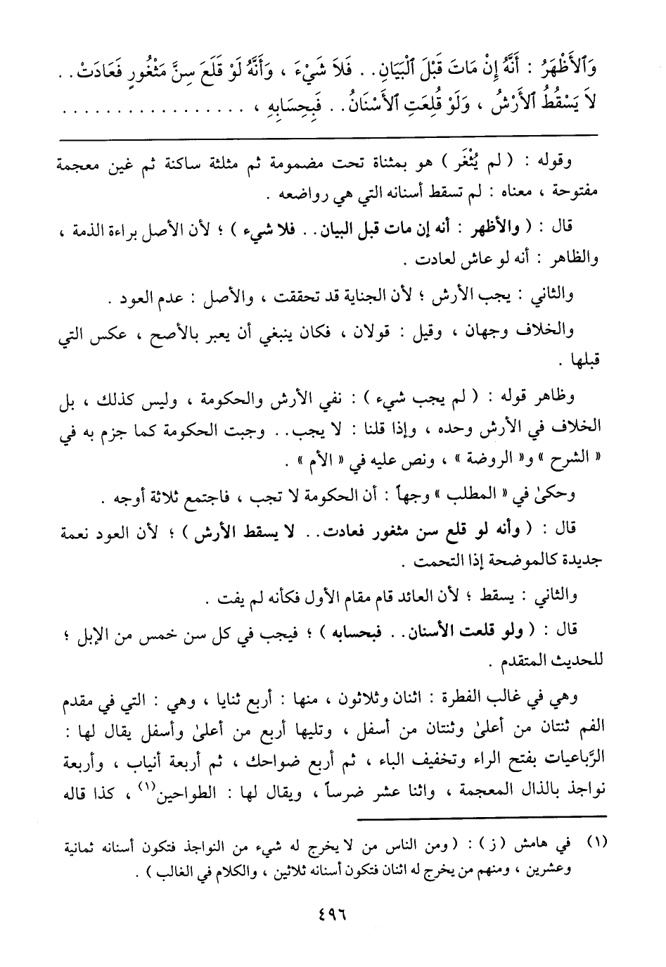 وَالأَظْهُر: أَنَّهُ إِن ماتَ قَبِلَ البَيان ... فَلًّا شيء، وَأَنَّهُ لُو قِلْع سَنّ مثغو فَعادَت .... لا يُسْقِط الأَرْش، وَلُو قَلَعتُ الأَسَنّانِ فَبِحِسابهُ،