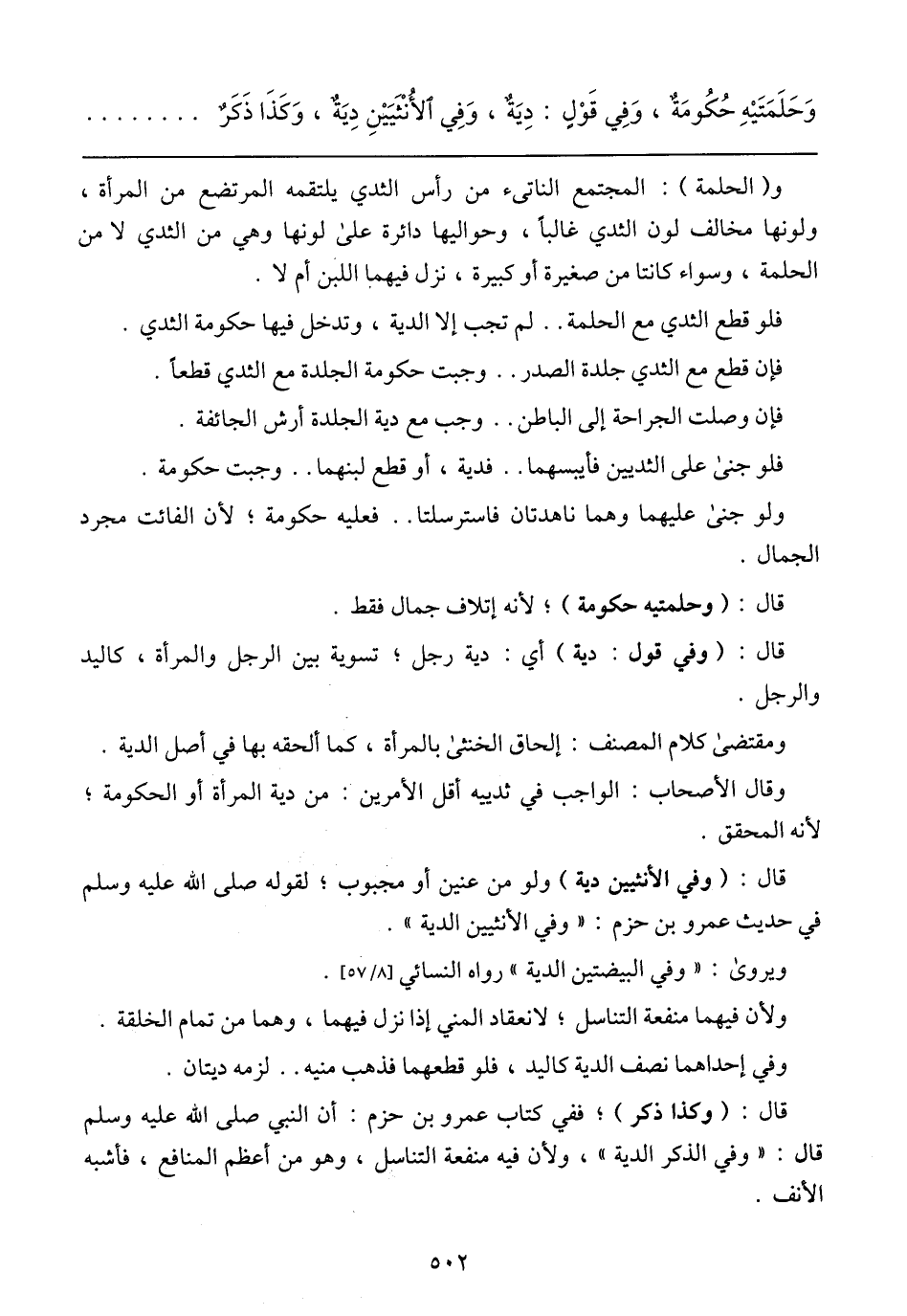 وَحَلَمَتيه حُكُومَة، وَفِيَّ نَزْل: دِيَة، وَفِيَّ الأُنْثَيَيْنِ دِيَة، وَكَذا ذِكْر