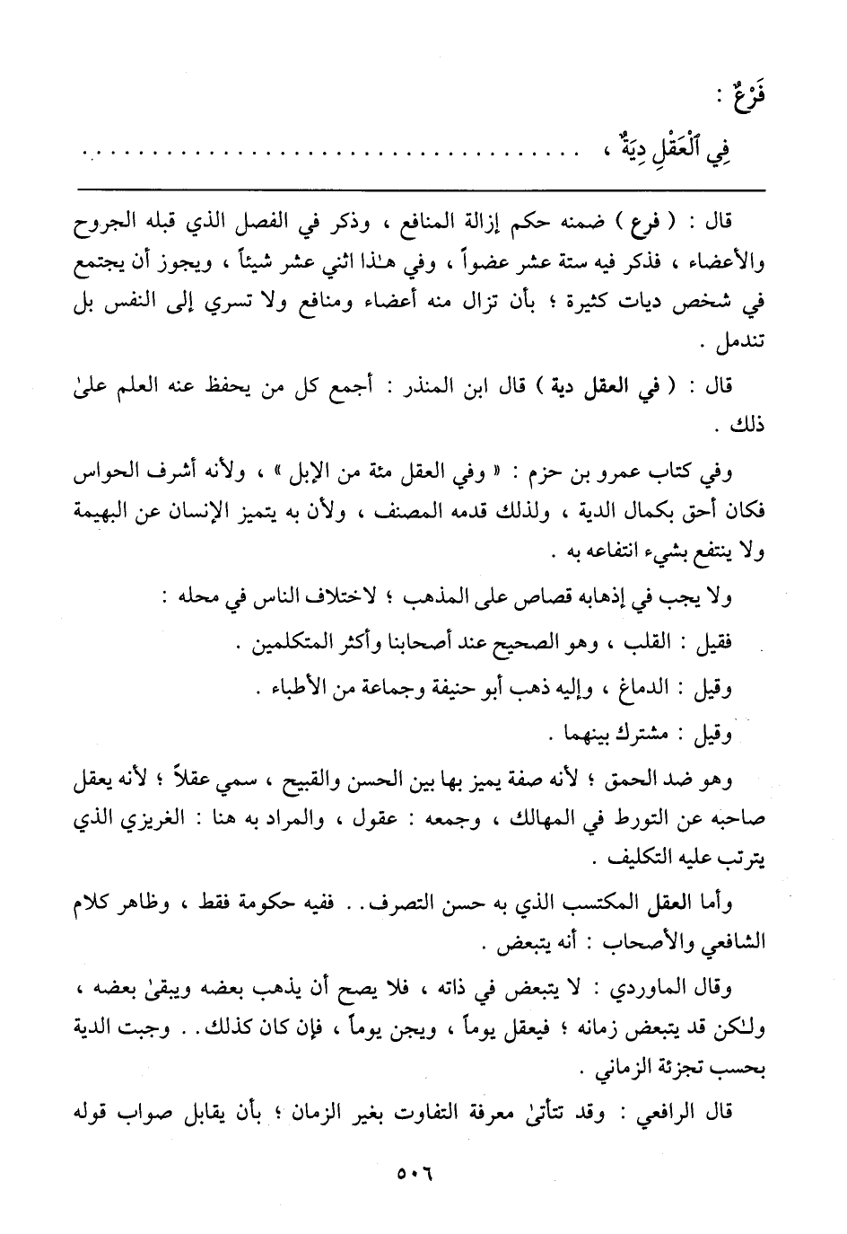 وفي كتاب عمر بن حزم: (وفي العقل مئة من الإبل).ولأنه أشرف الحواس فكان أحق بكمال الدية، ولذلك قمه المنص، ولأن به يتميز الإنسان عن البهيمة ولا ينتفع بشيء انتفاعه به.
