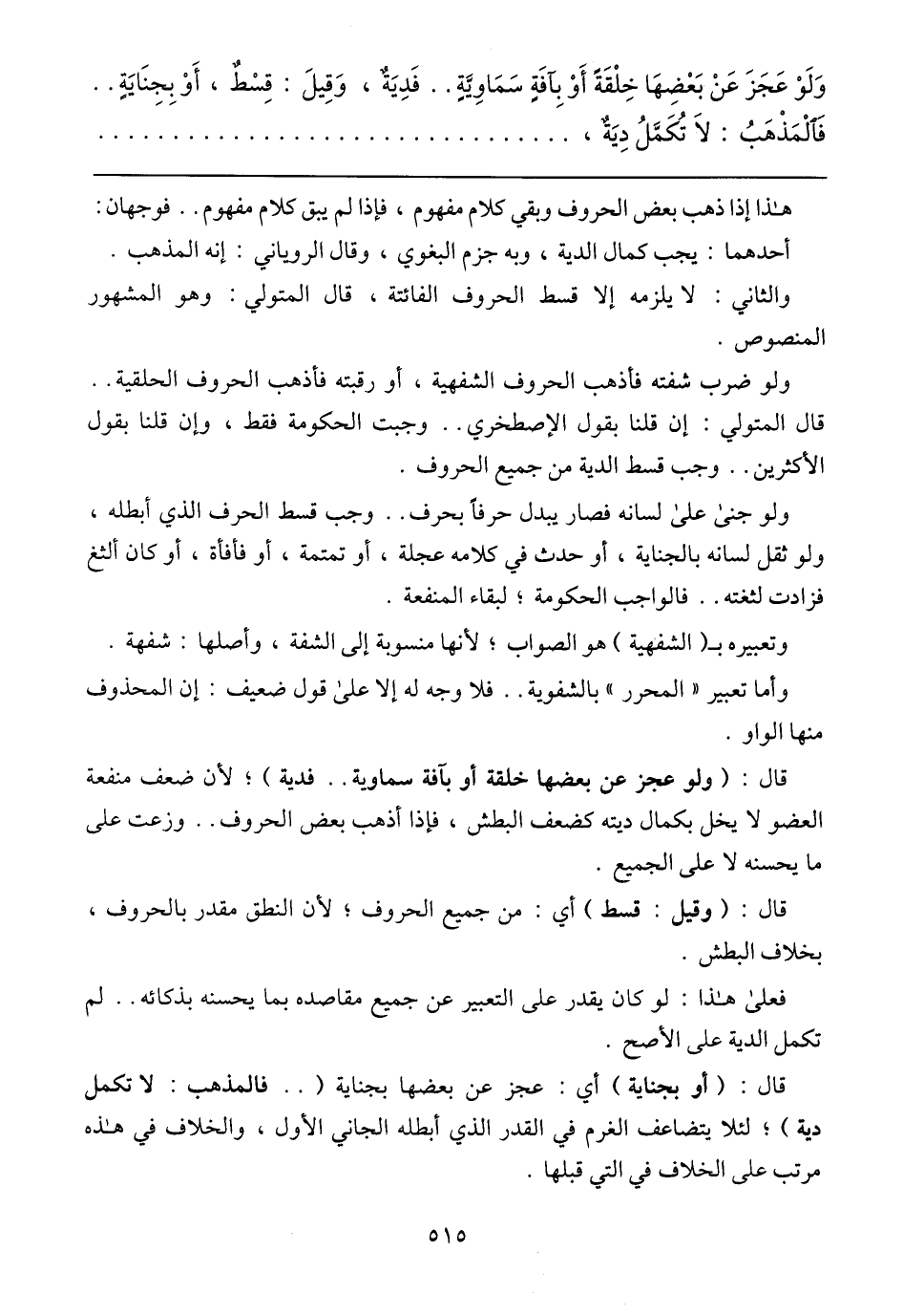 هذا إذا ذهب بعض الحروف وبقي كلام مفهوم، فإذا لم يبق كلام مفعوم ... فوجهان: أحدهما: يجب كمال الدية، وبه جزم البغوي، وقال الروياني: إنه المذهب.