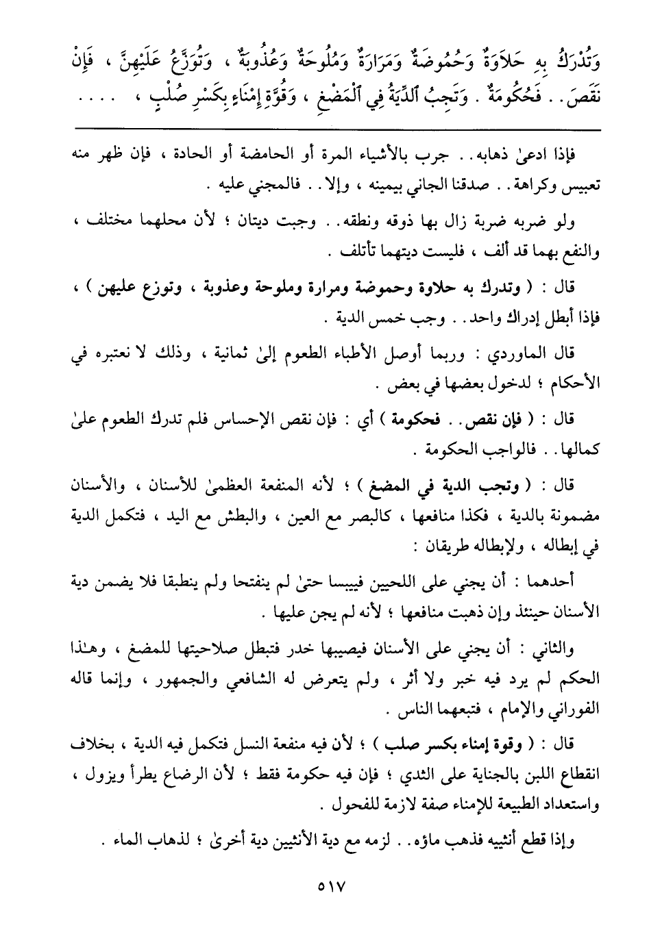 وَتُدْرِك بِهِ حَلاوَة وَحُمُوضَة وَمَرارَة وَمُلَوِّحَة وَعُذُوبَة، وَتُوَزِّع عَلِيّهُنَّ، فَإِنَّ نَقُصّ .... فَحُكُومَة. وَتَجَنَّبَ الدِيَة في المُضَغ وَقُوَّة إِمْناء بِكَسْر صَلَبَ،