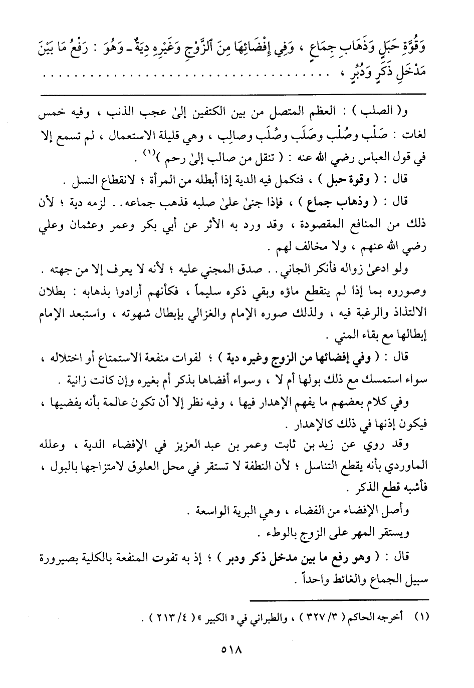 وَقُوَّة حَبَلَ وَذَهاب جِماع، وَفِيَّ إِفْضائها مَن الزَوْج وَغَيَّرَهُ دِيَة - وَهُوَ: رَفَعَ ما بَيَّننَ مُدْخَل ذِكْر وَدَبَرَ،